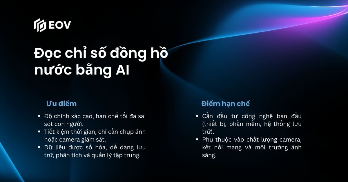 Không chỉ giúp giảm sai sót, AI còn tạo ra dữ liệu số hóa phục vụ công tác phân tích, dự báo và quản lý minh bạch. Đặc biệt, các giải pháp như EOV Water AI đang chứng minh hiệu quả trong việc tối ưu vận hành và tiết kiệm chi phí dài hạn.