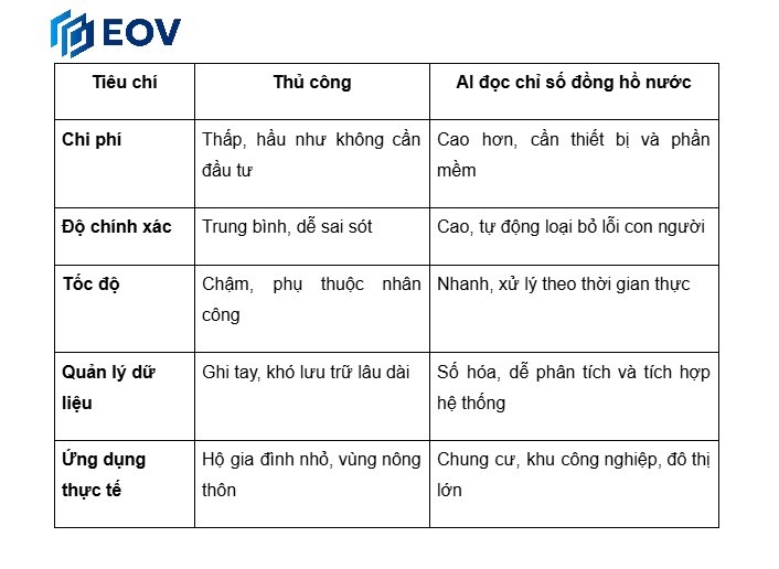 Để biết được cách đọc chỉ số đồng hồ nước nào tối ưu, dưới đây EOV Solutions sẽ đưa ra bảng so sánh cơ bản để các đơn vị có cái nhìn khái quát nhất: