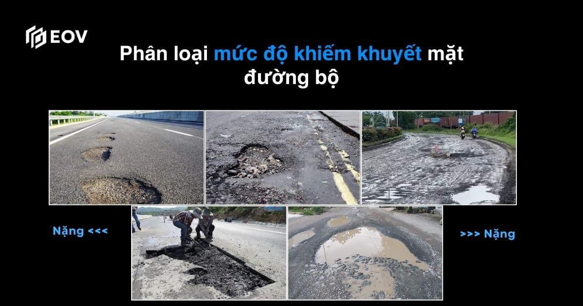Tại EOV Road AI, quá trình phân loại khiếm khuyết được tự động hóa bằng trí tuệ nhân tạo. Hệ thống sử dụng video hành trình kết hợp GPS để phát hiện, nhận diện và phân loại các dạng hư hỏng trên mặt đường.