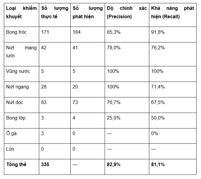 Bảng trên tóm tắt kết quả phát hiện các loại khiếm khuyết với các chỉ số Độ chính xác (Precision) và Khả năng phát hiện (Recall). Các loại khiếm khuyết chủ yếu bao gồm Bong tróc, Nút mang lưới, Vùng nước, Nút ngang, Nút dọc, Bong lớp, Ò gà và Lún.
