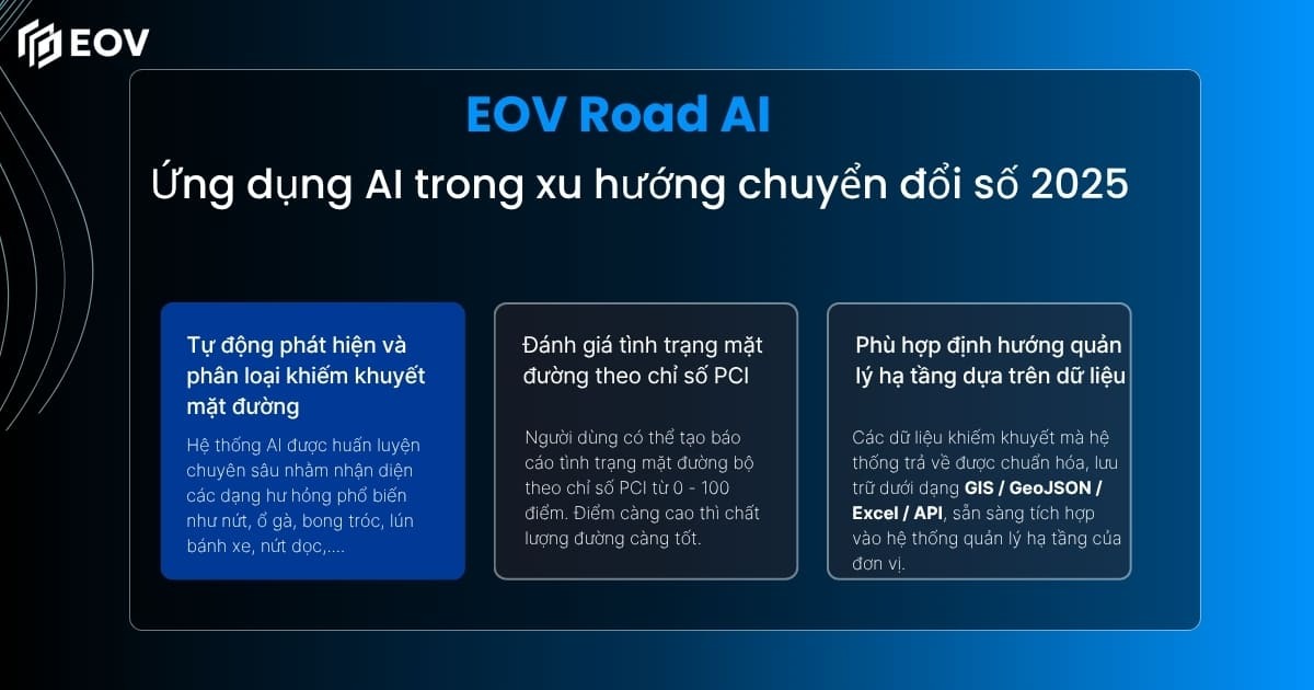 EOV Road AI là hệ thống do EOV Solutions trực tiếp nghiên cứu và phát triển. Giải pháp sử dụng video hành trình kết hợp GPS để phát hiện, phân loại và định vị các khiếm khuyết trên mặt đường.
